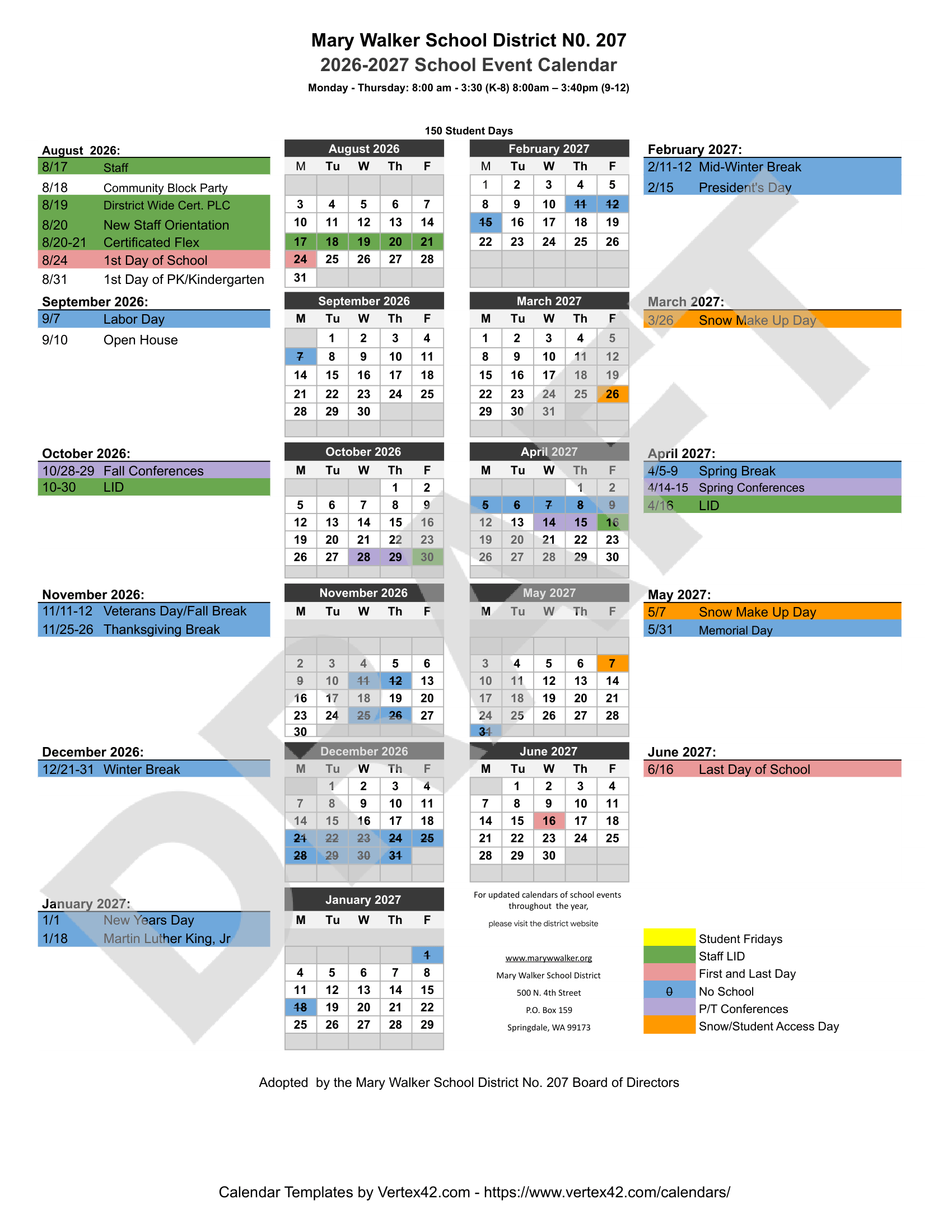 Mary Walker School District is sharing two draft versions of the proposed 2026–2027 school calendar for community review. Both drafts are available below for families, staff, and community members to review carefully.